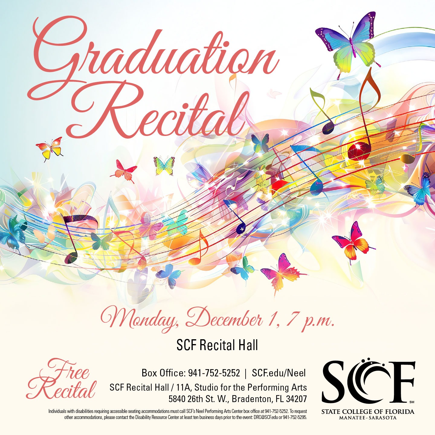 Dec 1 7:00 pm - 8:30 pm SCF Music Graduation Recital Studio for the Performing Arts Recital Hall, Bldg. 11A 5840 26th St. West, Bldg. 11A, Bradenton Event Details Get Directions