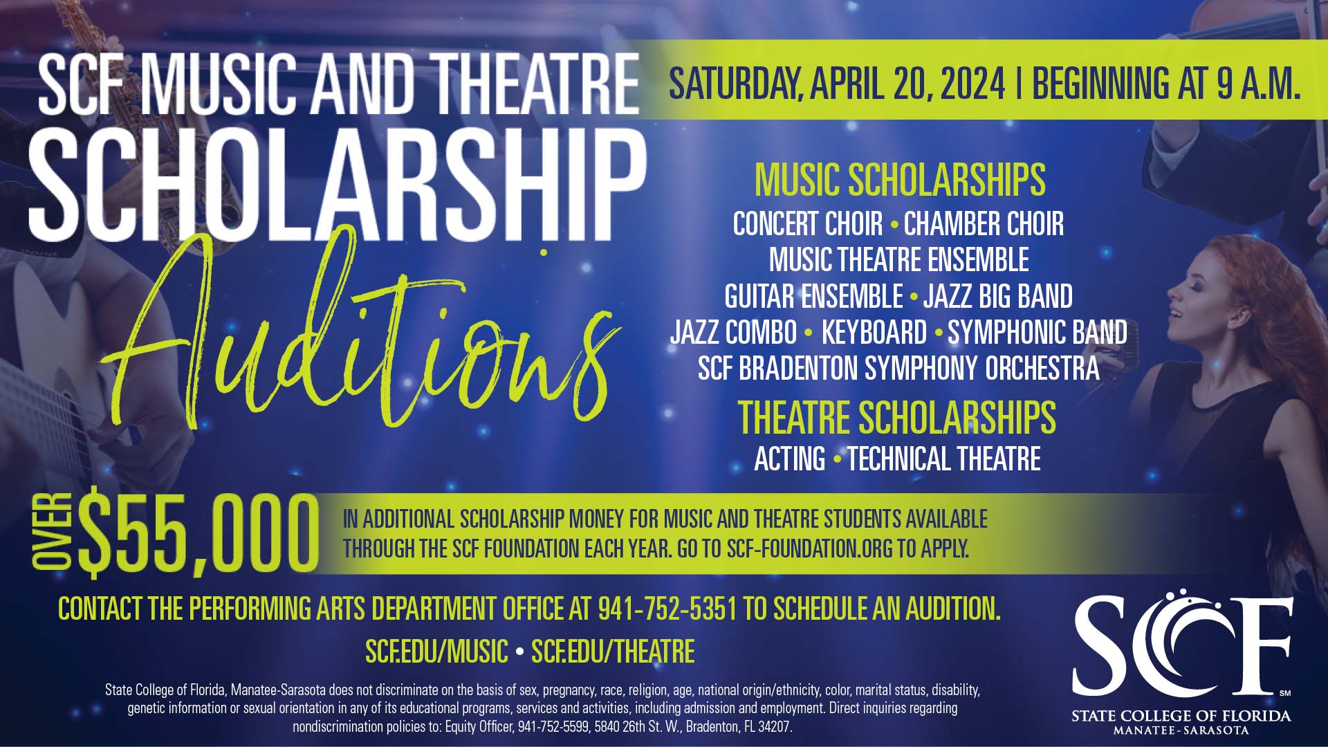SCF Music & Theatre Scholarships Auditions Saturday, April 20, 2024 9:00am check-in at the Neel Performing Arts Center Lobby To schedule an audition, you must contact in advance the Performing Arts Department at 941-752-5351 Music Scholarships available in concert choir, chamber choir, music theatre ensemble, guitar ensemble, jazz big band, jazz combo, keyboard, symphonic band, … Continued