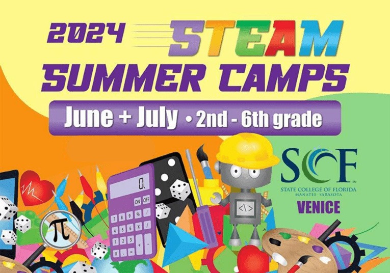 (Bradenton, Fla., May 16, 2024) — State College of Florida, Manatee-Sarasota (SCF) is accepting reservations for a new full-day STEAM summer camp program at SCF Venice for second to sixth grade students from June 3 to July 26, 2024, Monday through Friday, 8:30 a.m. to 4:00 p.m. for $299 per week. These camps will offer a dynamic blend of science, technology, engineering, arts, and mathematics (STEAM) activities, providing campers with an interactive, enriching, and inspirational educational experience.
