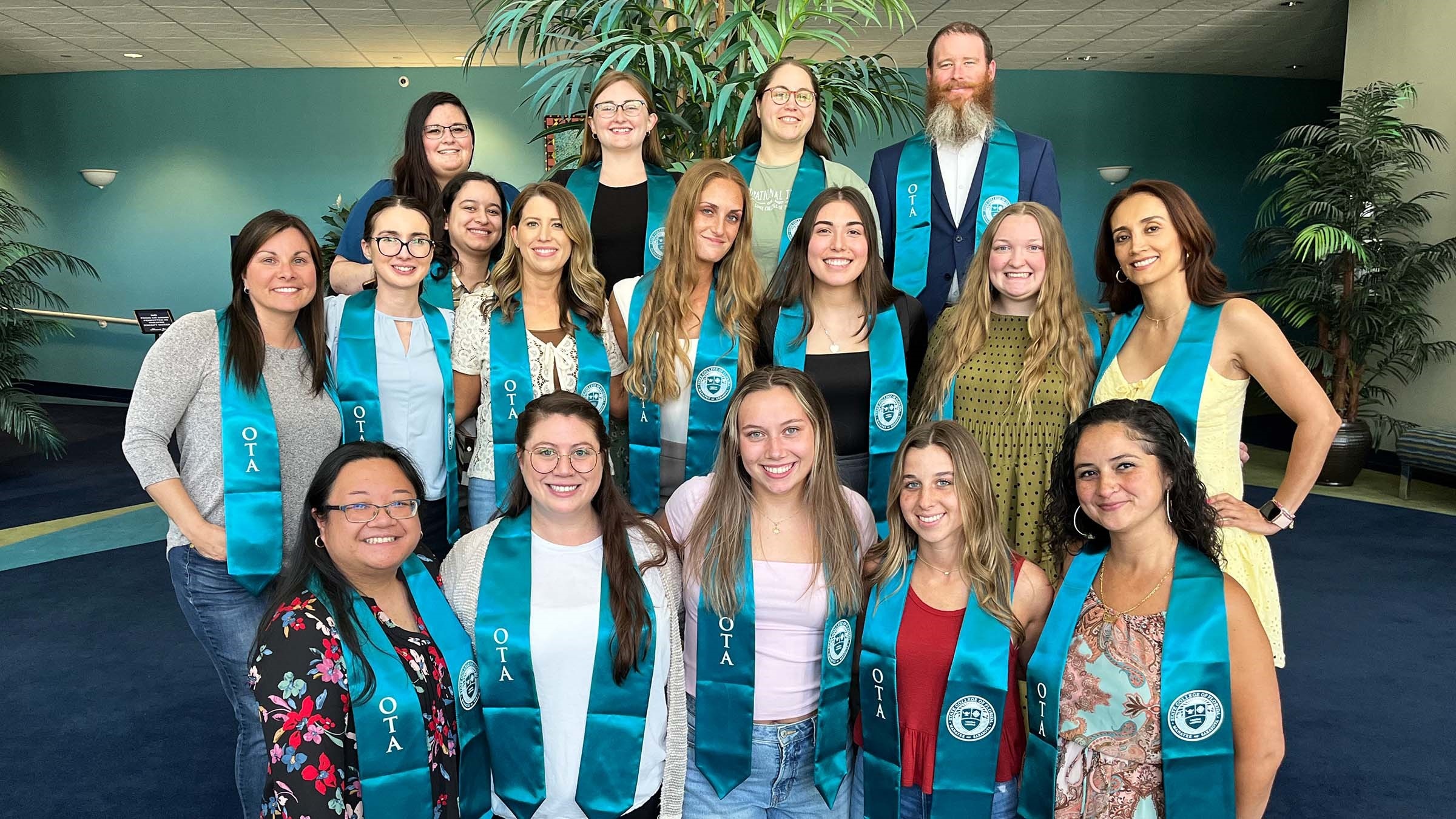 (Bradenton, Fla., May 5, 2025)—Eighteen occupational therapy assistant (OTA) program students from State College of Florida, Manatee-Sarasota were honored with their OTA pins on May 1. The special ceremony was part of the college’s weeklong Spring 2025 commencement festivities, including graduates, families, friends, and SCF faculty and staff who joined the milestone celebrations. The students graduated on May 2 with associate in science degrees and are eligible to enter the health care field or take the National Board for Certification in Occupational Therapy (NBCOT) exam.