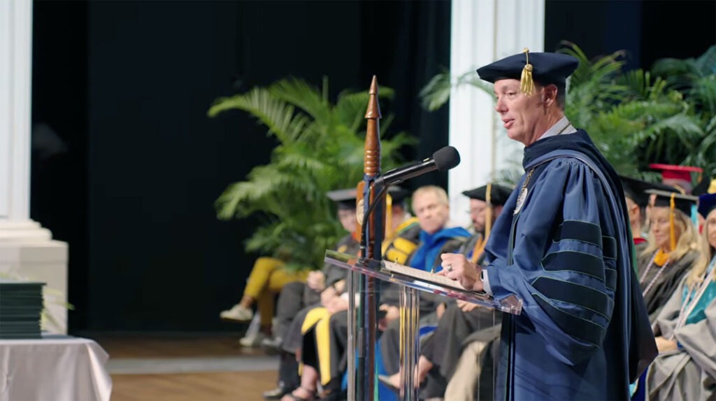 Photo caption: SCF President Tommy Gregory, J.D. addresses the audience at SCF Bradenton’s Winter 2025 graduation ceremony.